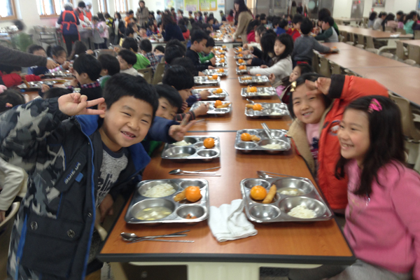 낮 12시 넘어 학생들과 함께 점심을 먹기 위해 식당에 온 송병일 교장. 7분도미를 사용하고 있었다는 걸 잘 몰랐단다. 상탄초는 교사들이 자율권을 갖고 다양한 프로그램들을 진행하고 있다. 건강한 먹거리 교육을 위해 텃밭 경작, 사랑의 김치만들기, 우리쌀 전통간식 체험, 벼농사 체험 프로그램도 진행한다. 봄부터 벼에 모를 내서 얼마전 떡을 만들어 떡잔치 축제를 열기도 했다. 노란 쌀눈이 있는 밥을 입안 가득히 넣으며 행복하게 웃는 상탄초등학교 학생들의 행복한 점심시간. 1370명이 어려서부터 건강한 우리 쌀, 밥맛을 익히며 우리 농가의 희망을 만들어가고 있었다.