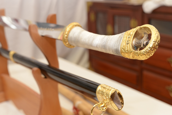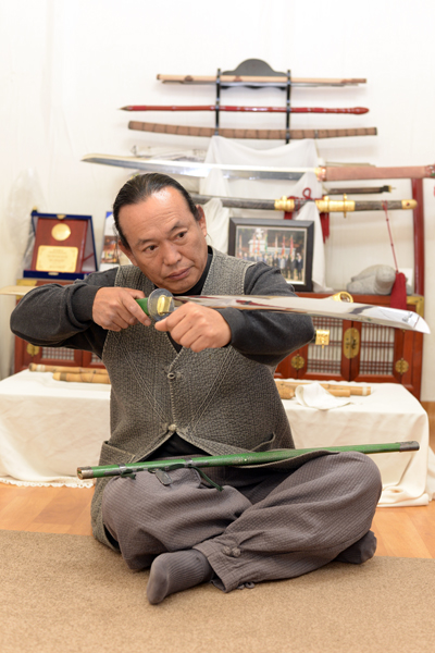 1980년대 초반, 손재주가 남달랐던 그는 나전칠기 기술을 배우는 과정에서 도검의 칼집에 칠을 해달라는 의뢰를 받았다. “처음 도검을 봤을 때 가슴이 뛰더라구요.” 첫 만남의 강렬함. 그는 곧 도검의 세계로 깊이 빠져들었다. 이후 유적선 선생의 가르침으로 ‘사인검(四寅劒)’제작에 꼭 필요한 기술인 ‘박음상감’기법에 눈을 뜰 수 있었고, 전용하 선생의 도움으로 전통도검에 대한 상식을 넓힐 수 있었다. 임명길 선생으로부터는 환도제작의 비기인 칼날 숯돌 연마 기능, 쇠불림 기능, 날붙이(접철, 단조) 기능, 쇠를 강화하는 담금질·풀림·뜨임 기능 등을 배웠다. 솜씨 좋고 눈썰미 있는 그는 1990년부터 곽재우 장군의 검을 재현하기 시작해 이순신 장군의 칼, 김유신 장군의 신라시대 용봉환두대도, 경복궁 근정전의 운검, 별운검, 사인검 등 다양한 전통도검을 재현해왔다. 2003년엔 제28회 전승공예대전에서 조선시대 사인검을 출품해 이 분야 최고의 상인 대통령상을 수상했다.