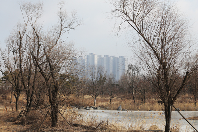 생태공원의 인공 연못과 멀리 보이는 초고층 아파트가 대조를 이룬다. 겨울엔 생태공원 탐방객을 받지 않는다. 대신 사람이 찾지 않는 겨울 생태공원에는 가끔 고라니들이 먹이를 찾아 방문하고 있다.