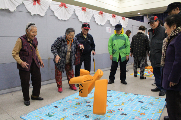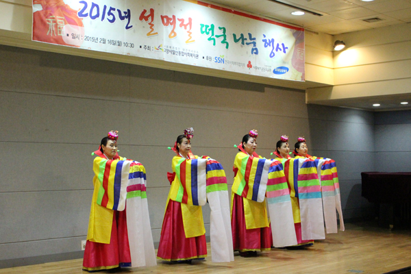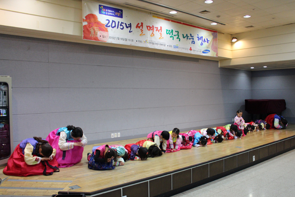 1부 행사로 우리나라 전통놀이인 투호와 굴렁쇠, 윷놀이, 제기차기, 팽이치기를 다문화 가족 봉사자들의 도움을 받아 체험하며 서로간의 화합을 다질 수 있는 시간이 되었다. 2부에서는 예쁜 한복을 곱게 차려입고 온 성모어린이집 아동들이 무대에서 세배를 올리고 어르신들은 아이들의 조그만 손에 사탕을 쥐어주기도 하며 즐거워했다. 한편, 특별공연으로는 복지관 한국무용팀의 공연이 진행되어 어르신들을 비롯한 복지관 직원, 자원봉사자, 다문화 가족 모두가 한 마음이 되어 즐겁게 행사에 참여할 수 있었다.