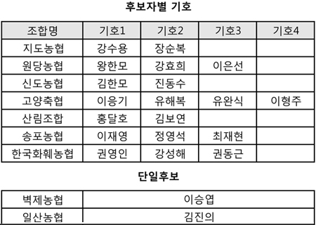 이중 조합별 출마자를 보면 덕양구 원당농협은 강효희, 왕한모, 이은선 후보가 신도농협은 김한모, 진동수, 후보, 고양축협은 유완식, 유해복, 이응기, 이형주 후보, 지도농협은 강수용, 장순복 후보, 산림조합은 김보연, 홍달호 후보가 벽제농협은 이승엽 현 조합장이 단일 후보로 출마했다.