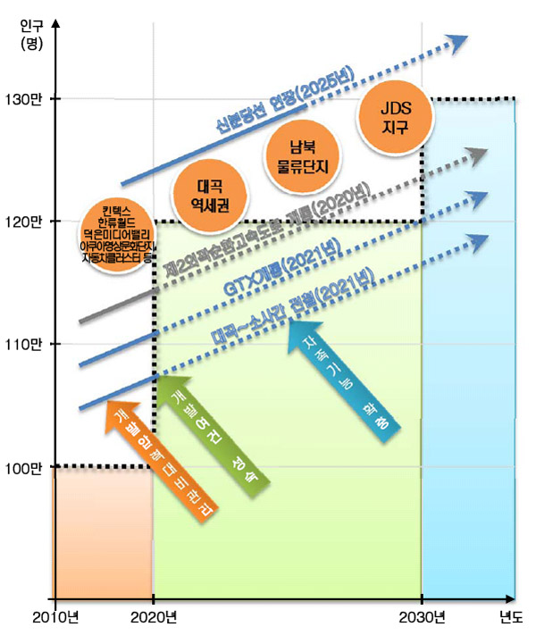 교통망은? 도로망 계획은 시도 92호선을 연장하고, 김포~관산간 도로, 백마로 노선 연장 등 주간선도로를 확충하고, 중앙로는 교통체계 관리 기능을 강화한다. 신분당성, GTX, 교외선 전철화 사업, 대곡~소사간 등 철도망을 추가로 갖추게 되고, 이는 남북교류 물류단지의 토대가 된다.