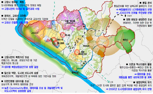 시민들의 관심이 집중되는 토지 이용계획은 고양시 주요사업의 우선 순위가 고려됐다. 한류월드와 킨텍스 관련 지원 시설의 조성, 덕은 미디어밸리, 자동차 클러스터, JDS지구 및 대곡역세권, 남북 물류단지. 계획대로라면 2030년 JDS지구를 추진하게 된다. 삼송, 지축, 원흥, 향동, 등 실시계획, 도시관리계획 등 고시 승인 지역을 시가화 용지로 추진하고, 기존 JDS지구, 덕은미디어밸리 예정지는 시가화예정용지로 신규지정한다는 계획이다.