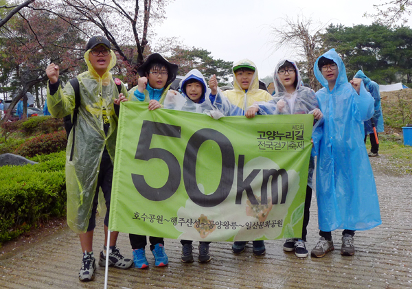 공양왕릉에 접어들었을 때에는 가랑비가 내리기 시작하면서 빗줄기가 굵어졌지만 참가자들은 우비를 입거나 우산을 쓴 채 걷기를 계속했다. 이들은 길상사에서 점심식사를 한 후 백마역을 거쳐 정발산을 걸으며 전날 출발점인 일산문화공원에 오후 2시경 도착했다. 문화공원에서는 고양시산림조합의 협조로 자그마한 화분에 담긴 꽃을 50㎞ 완주자에게 모두 전달했다. 50㎞에 참가한 김세현·박준형·양진문·윤대건·심준혁 학생(화정중 1학년)과 송국회 학생(무원중 1학년)은 “어제와 오늘 걸은 길은 모두 처음이지만 기억에 남는다. 자연정화활동으로 쓰레기도 주워 뿌듯하기도 했다”고 말했다.