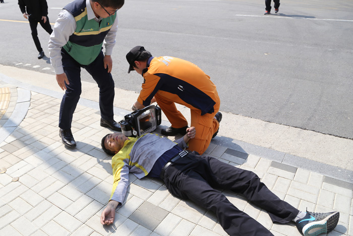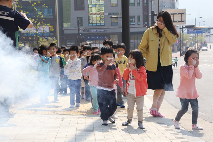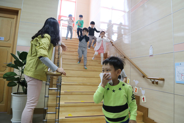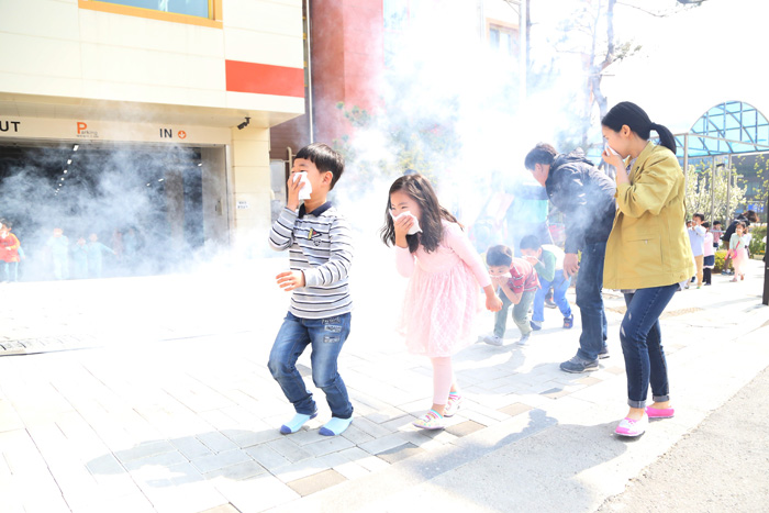 유치원에 화재경보 비상벨이 울리자 교실에 있던 어린이들이 교사의 도움을 받아 허리를 숙인 채 계단을 내려왔다. 건물 밖으로 빠져나올 때는 신발도 신지 않고 신속히 움직이는 모습이 실제 상황을 방불케 했다.