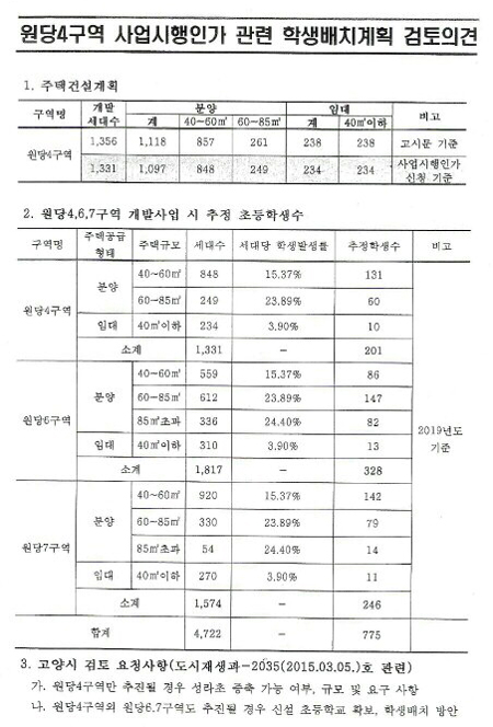 원당4구역 사업시행인가를 위한 성라초 학생배치 계획 협의는 3월 고양시 도시재생과와 고양교육청 경영지원과 사이에 공문으로 진행됐다. 고양교육지원청은 3월 30일 공문을 통해 “원당4구역 입주민 자녀는 당초 신설초 설립을 통하여 배치할 계획이었으나 고양시에서는 원당4구역 사업시행인가와 관련하여 직소민원 해결방안을 위한 부시장 주재 TF회의를 수차례 진행해 4구역만 추진될 경우 성라초 학생 배치검토를 요청했다”고 밝혔다.