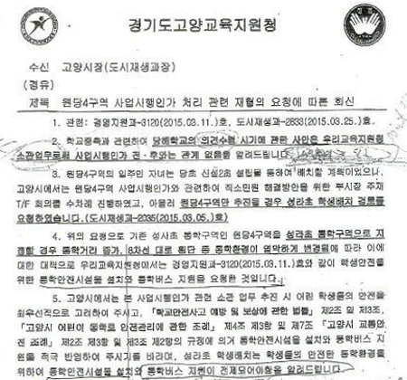 이에 고양교육청은 “기존 성사초 통학구역인 성라초 통학구역으로 지정할 경우 통학거리 증가, 8차선 대로 횡단 등 통학환경이 열악하게 변경됨에 따라 교육지원청에서는 3월 11일 학생안전을 위해 통학안전 시설물 설치와 통학 버스 지원을 요청했다”며 “학교 증축과 관련한 해당 학교의 의견 수렴시기는 교육청 소관업무”라는 입장을 전달했다.