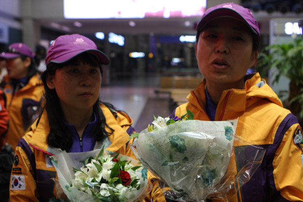 지난 4일 인천공항에는 경기도체육회 관계자들과 작년도 줌마탐험대들이 나와 일행을 맞이하고 꽃다발을 전해주었다. 자정넘어 늦은 시간까지 취재 열기도 뜨거워 방송사와 통신사, 신문기자들이 일찍부터 출국장에 나와 일행을 기다렸다.