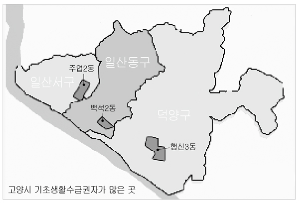 형적으로 고양시는 복지 인프라가 잘 갖춰져 있다. 고양시 곳곳에 복지관들이 들어서 있다. 그 중 관심을 가져야 할 곳이 백석2동·주엽2동·행신3동이다. 이 세 곳은 고양시에서 기초생활 수급권자 수가 가장 많은 동네다. 특히 백석2동은 고양시 수급권자의 약 25%가 몰려있다.