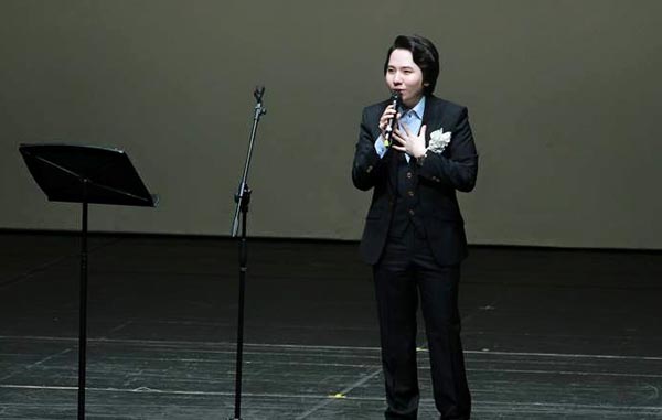 18일 고양어울림누리 어울림극장을 찾은 팝페라테너 임형주씨. 첫 곡으로 멋진 아베마리아를 선사하고 인사말을 전했다. 메르스 여파로 행사와 공연이 연이어 취소되는 상황에서도 마스크를 쓴 시민들이 의미있는 공연 자리에 함께 했다. 주최측에서는 열감지기와 손 소독제, 마스크 등을 준비했다.