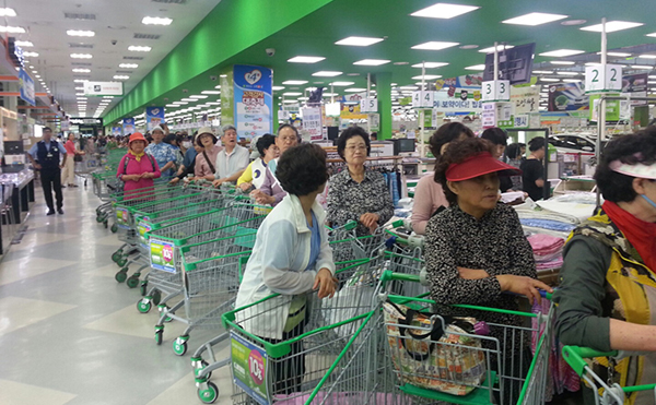 농협고양하나로마트(대화동 소재) 입구에서 소님들이 아침마다 줄을 서는 진풍경일 펼쳐지고 있다. 지난 주말은 특히 더했다. 마트 개장 전부터 손님들이 줄을 100m 이상 늘어서 수박과 마늘을 사기위해 장사진을 이뤘다. 수박은 6800원에, 마늘은 평소의 1/3 가격에 판매되다 보니 사람들이 이렇게 모여든 것.