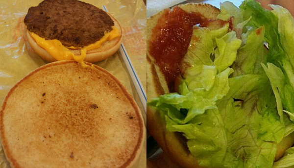 롯데리아보다 맥도날드가 더 좋다고 꼽은 백양초 어린이들. 사진을 보면 그 이유를 알 수 있다. 양상추 등 야채가 많은 롯데리아 햄버거(왼쪽)와 고기와 치즈만 있는 맥도날드 햄버거.