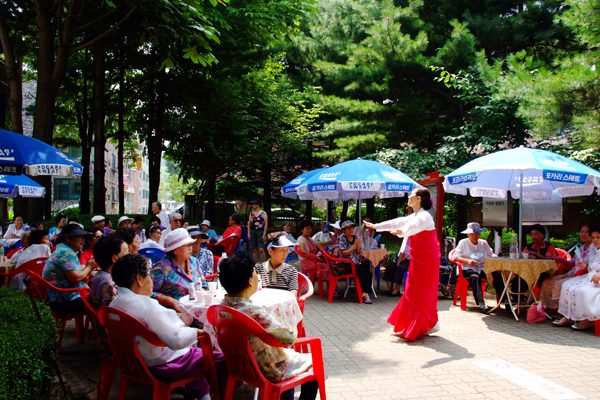 지난 12일 일산 대화동 토성공원. 그늘 아래 앉아 공연을 즐기는 어르신들의 얼굴이 여유로워 보였다. 일산노인복지센터(원장 이수영)와 수정실버하우스(원장 임정빈)가 4년째 한 주도 거르지 않고 마련하고 있는 이날 급식봉사에 참석한 어르신 50여 명은 식사에 앞서 바이올린 연주와 고전무용을 감상했다<사진>. 이어 말복을 맞아 준비한 닭곰탕과 정갈한 밑반찬으로 차린 식사를 했다.