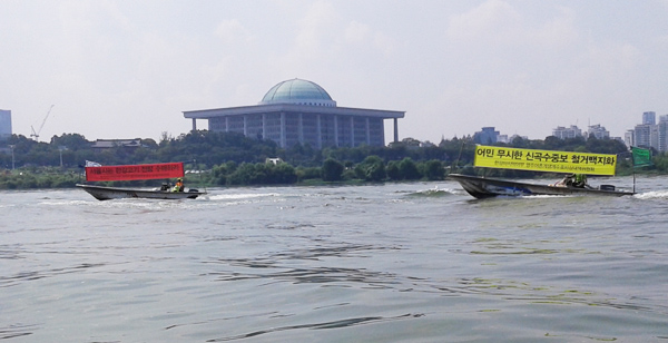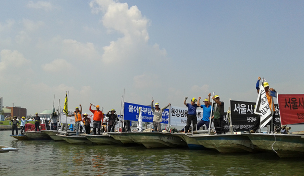 덕양구 행주동 어민들이 서울시에 피해 보상을 요구하며 선상 시위를 벌였다.