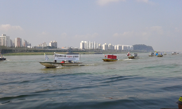 행주어촌계 어민 30여 명은 지난 30일 2시간 동안 한강 행주나루에서 여의도 국회 앞까지 약 10km 구간에서 배 24척과 대형 플래카드를 동원해 선상 시위에 나섰다.