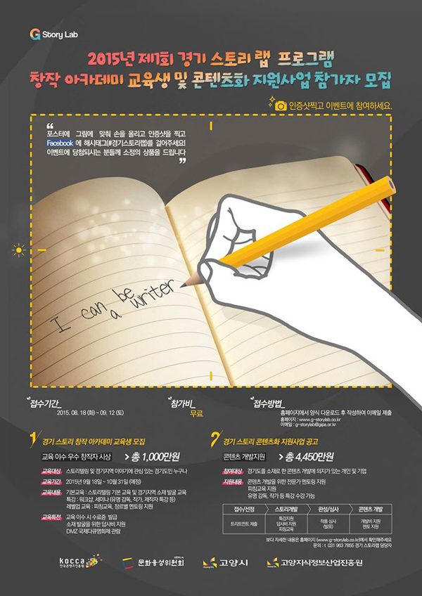 경기도 고양시와 고양지식정보산업진흥원이 문화체육관광부·한국콘텐츠진흥원이 추진하는 2015년 지역 스토리랩 프로그램 참가자를 모집한다.