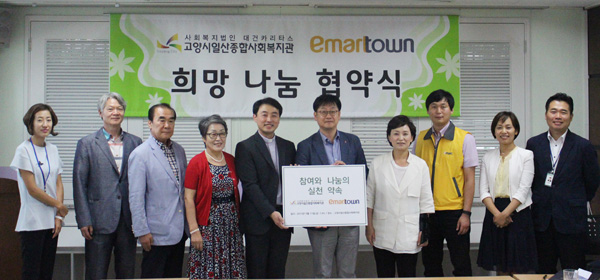 일산종합사회복지관이 지난 11일 오후 1시 이마트타운과 희망나눔 협약식을 가졌다. 이날 협약식에는 이정우 일산종합사회복지관장(가운데 왼쪽), 서보현 이마트타운지점장(가운데 오른쪽), 국회의원과 내외빈, 직원 등이 참석했다. 이마트타운은 연 1회 복지관 바자회 지원, 저소득 어르신을 위한 명절(추석, 설)행사 후원과 봉사활동에 대한 지원도 약속했다.