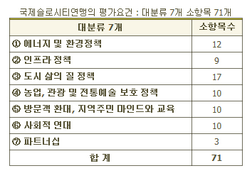 평가항목은 생각보다 많다. 가입하려면 7개 분야 71개 세부 평가항목의 요건을 갖추어야 한다<표 참고>. 구체적 사항으로 친환경적 에너지 사용, 자전거 도로의 길이 등을 포함한 자전거의 생활화, 생태농업과 로컬푸드의 활용, 소수자와 사회적 약자에 대한 배려 등이 포함돼 있다.