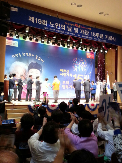 큰 마당(대강당)에 들어서자마자 눈에 띄는 것은 어르신들의 정성어린 손글씨로 꾸며진 15주년 축하 메시지였습니다. 그 메시지를 풍선에 매달아 천장을 아름답게 장식하여 멋스럽게 분위기를 연출해 놓았습니다. 축하의 빵파레를 울려 멋진 휘장을 잡아 올리고 식순에 따라 이사장 환영사, 시장 축사, 지역국회의원과 내빈 등의 성원 속에 진행되는 기념식에는 평소 잘 오시지 못하는 노인분들까지 함께하는 흥겨운 자리였습니다.