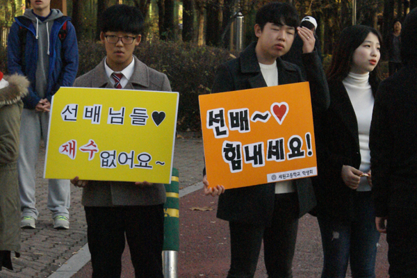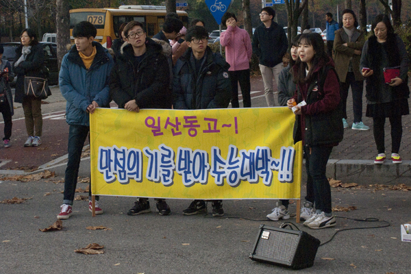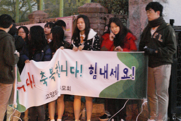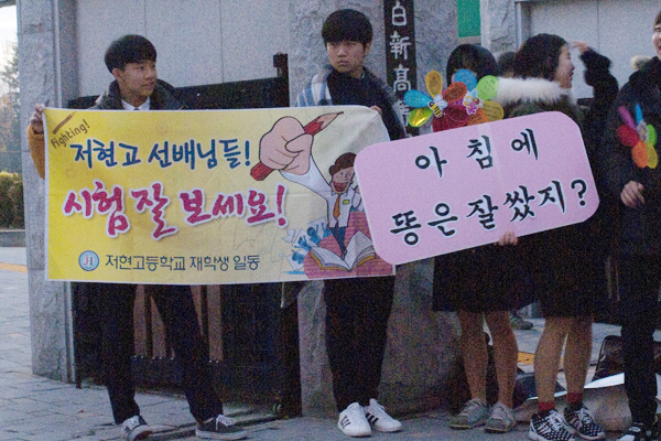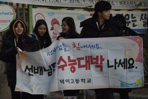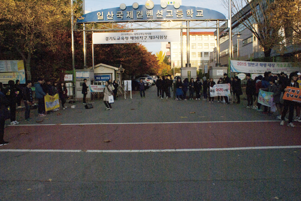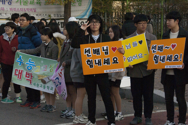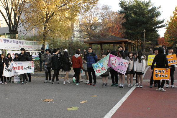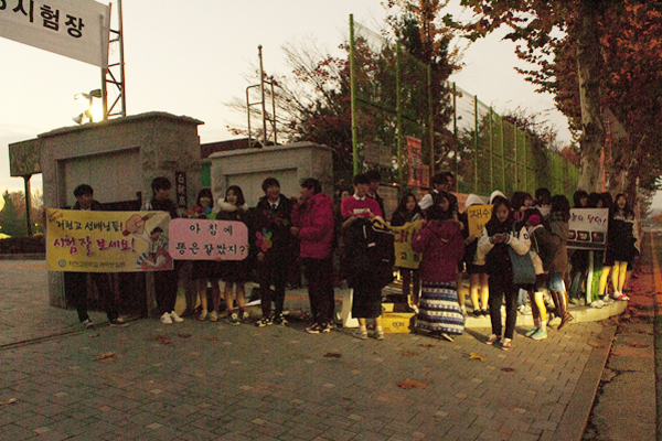 새벽 6시 반, 2016학년도 수능이 치러지는 백신고등학교 정문 앞은 수험생들 응원 준비를 하는 학생들로 붐볐다. 수험생들이 시험장에 도착하기도 전인 새벽 6시부터 고사장 앞을 지키던 고양외고 학생들은 "선배들을 응원하기 좋은 자리를 선점하기 위해 일찍 왔어요. 또 인생의 전환점이 되는 중요한 시험이고 내년이면 저희도 이 시험을 치러야 하기 때문에 마음으로 응원하고 싶었어요"라고 했다.