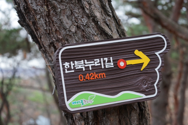 고양누리길 2코스인 한북누리길은 북한산탐방지원센터에서부터 효자마을, 중고개, 옥녀봉과 지축동의 숲길을 지나 삼송역까지 이어지는 6.5km의 길이다. 어느 쪽을 출발점으로 삼느냐에 따라 북한산이 점점 가까워지거나, 점점 멀어지는 공간 체험을 할 수 있는 매력적인 코스다. 최근에는 매미골누리길이 보태어져 북한산을 바라보는 새로운 조망 포인트를 선물해주었다. 매미골누리길은 효자치안센터 뒤편 대선교와 흥국사 아래쪽 절골마을 입구를 이어주는 1.8km의 오솔길로서 창릉천 건너편으로 북한산을 바라보며 노고산 자락을 넘는 길이다.
