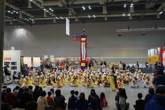 우리의 전통 공연은 출연자와 관객의 경계가 명확하지 않은 것이 특징. 무대와 객석이 섞일 수밖에 없는 킨텍스 전시장의 특성은 오히려 가와지볍씨 공연의 장점을 극대화할 수 있는 공간적 구성을 가능케 했다. 또한 슬로푸드페스티벌을 구경 온 관객들과 다양한 국적의 해외 참가자들에게 자연스럽게 우리의 전통 문화 공연을 접할 수 있는 기회도 제공했다. 객석의 가운데를 가로지르며 공연의 문을 연 길놀이를 시작으로 연주와 노래 등은 무대에서 펼쳐진 반면, 두렛소리 공연이나 십이지신 불한당놀이 등은 넓은 홀에서 마당놀이처럼 펼쳐졌다. 마치 놀이패들이 동구밖에서 들어와 마을의 안팎을 자유롭게 넘나들며 신명나는 놀이판을 벌이는 듯했다. 이러한 변화무쌍한 공간 활용으로 관객들 역시 수시로 시선과 동선을 바꿔가며 흥미롭게 공연에 몰입할 수 있었다.