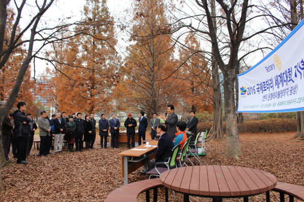 지난 24일, 호수공원 장미정원 건너편 잔디정원에서 포근하고 의미 있는 행사가 열렸다. 이날 행사에는 2016국제로타리 세계대회(5월 28일 ~ 6월 1일)를 앞두고 이를 기념하는 시설물 기증식이며 2016 국제로타리 세계대회 임효순 운영위원장, 3690지구 길광섭 총재, 각 클럽 로타리 회원들과 최성 시장 등 80여 명이 참석한 가운데 시설물 기증식이 열렸다. 기증 시설물은 벤치 30개, 원형테이블 4인용 6조와 8인용 3조, 그리고 20인용 평상 3개로 5000만원 상당의 물품이다.