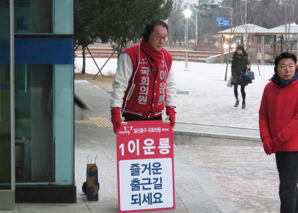 지난 26일은 이른 아침부터 고양시에 눈이 내렸다. 눈이 오는 궂은 날씨에도 총선 후보들의 발걸음은 바쁘기만 하다. 아침 출근시간대 백마역에서 피켓인사를 하고 있는 일산동구 새누리당 이운룡 국회의원.