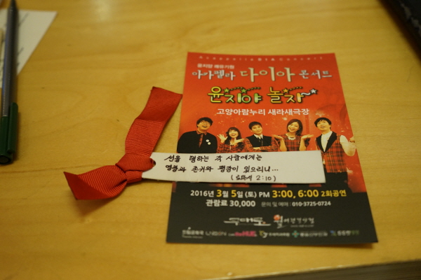 콘서트를 즐겁게 즐겨달라. 무거울 필요가 전혀 없다. 3만원 이상의 값어치 자신한다. 거기에 더해 윤지도 도와 행복이 두 배가 되는 경험을 하면 좋겠다. 공연의 마지막에 잠깐 윤지의 이야기와 영상을 보며 우리가 함께 응원한다는 메시지를 전하고 싶다. 사실 단순히 300만원이라는 금액을 모으는 것에만 목적을 둔다면 오랜 시간과 노력을 들여 힘들게 무대를 꾸밀 이유가 없다. 그냥 뜻있는 분들을 몇 몇 설득해서 기부를 받으면 된다. 하지만 이 공연의 취지는 이웃의 아픔에 함께하고픈 사람들이 모여서 윤지를 응원하는, 입장료를 내고 함께 무대를 즐기는 500명이 넘는 동참자들을 만드는 것이다. (커피숍 카운터에서 일하는 분을 가리키며)단골 커피숍에서 일하는 분도 두 장을 사 주셨다. 공연장을 찾은 평범한 이웃들의 마음이 하나가 되어 윤지의 쾌유를 위해 응원의 박수를 보내주는 것, 이것 자체가 커다란 기적이 아니겠는가.