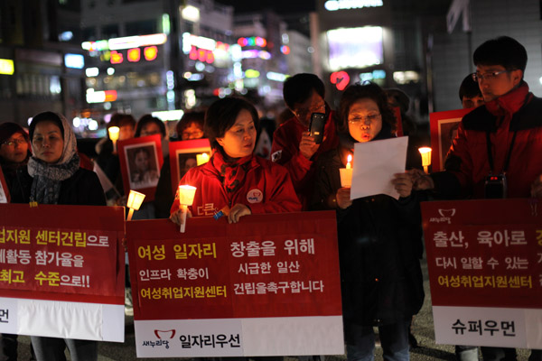 4·13 총선을 앞두고 여성종합취업지원센터 건립을 촉구하는 촛불시위가 지난 1일 일산동구 중앙로에 있는 롯데백화점 앞에서 벌어졌다<사진>. 이날 촛불시위에는 고양시여성연합회 박미화 회장을 비롯해 임원진 포함 고양시 여성 30여 명이 함께했다.