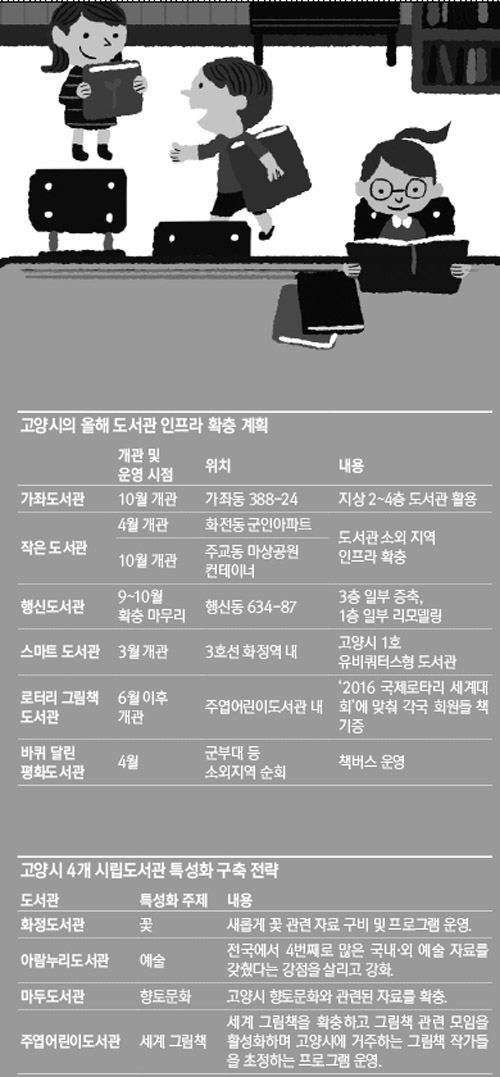 ‘아주 특별한 책의 도시 고양’이라는 말에 걸맞게 고양시 도서관센터는 올해 도서 관련 인프라를 확충할 계획이다. 가좌도서관과 2개의 작은도서관, 스마트도서관, 로터리 그림책 자료실 개관과 행신도서관 확충, 버스책 운영 등 6가지로 올해 도서관 인프라 확충 내용을 요약할 수 있다.