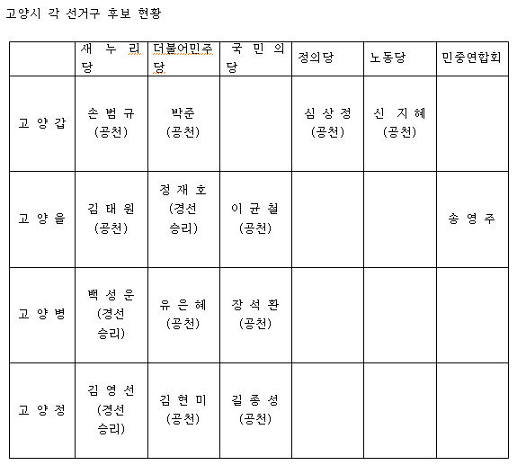 20여일 앞둔 4·13 총선을 위한 여야의 공천작업이 마무리 수순을 밟고 있는 가운데 고양시의 4개 선거구별 후보자 윤곽이 서서히 드러나고 있다.