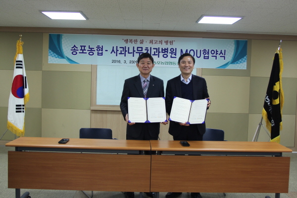 송포농협(조합장 이재영)은 지난 23일 송포농협 본점 회의실에서 고양의 대표적인 치과병원인 사과나무치과병원(이사장 김혜성)과 치과 의료 서비스와 관련한 업무협약을 체결했다. 이번 협약에 따라 사과나무치과병원은 송포농협 임직원과 조합원 본인, 또는 직계가족이 병원을 찾아 진료를 받을 때 비 보험 진료비 감면 혜택을 적용하게 된다. 또한 의료 취약 계층에 대한 폭넓은 의료 서비스 확대를 위하여 상호 노력하기로 했다.