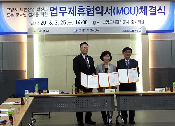 고양시·도시관리공사·(주)일렉버드UAV는 지난달 25일 무인비행장치인 드론의 교육장 설치를 위한 업무제휴협약(MOU)식을 가졌다. 이번 협약으로 고양시는 청주·평택에 이어 전국에서 세 번째로, 수도권 지역에서는 최초로 ‘초경량비행장치 조종자격’을 취득할 수 있는 전문교육기관인 드론교육원을 설치하게 됐다.