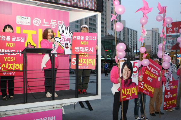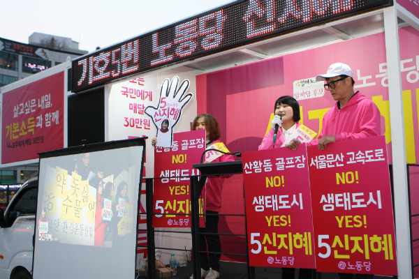 고양갑 노동당 신지혜 후보가 고양시 마을버스 직영화와 방사능으로부터 안전한 학교급식을 위한 조례제정 등 이른바 ‘생태도시 고양’을 위한 지역공약을 발표했다. 신 후보는 이 밖에도, 서울-문산 간 민자고속도 건설과 산황동 골프장 증설을 반대한다는 입장을 분명히 했다.