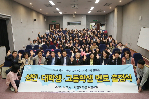 지난 9일 오후 화정도서관 시청각실. 무대에 오른 13명 고등학생들이 11개에 달하는 ‘멘토 다짐’을 하나씩 읽어나갈 때마다 객석에서 박수와 환호가 터졌다. 이날 ‘책을 통해 꿈을 응원하는 도서관의 친구들’ 출정식이 멘토 100여 명이 참석한 가운데 있었다.