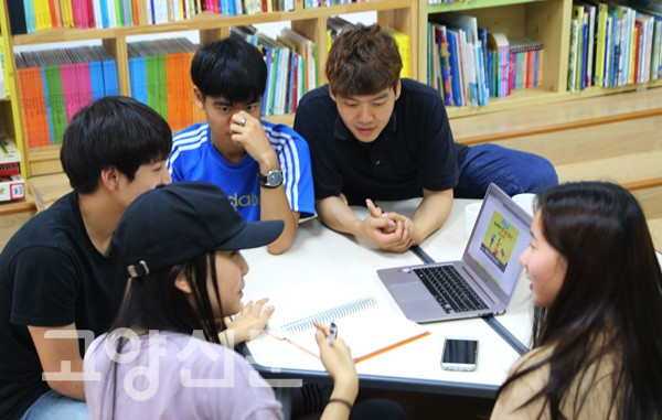 한쪽에선 노트북을 사이에 두고 4명의 학생들이 영상 공모전을 준비하느라 머리를 맞대고 영상 콘티 짜기에 분주하다.