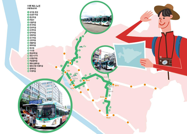 이 대화의 뜻을 이해한다면 당신은 적어도 인생 학교 4~5학년 이상이리라. 그랬다. 승용차가 많지 않던 시절, 사람들은 도보로 이동하는 뚜벅이를 ‘11번 버스’라고 말하곤 했다. 두 다리를 11이라는 숫자에 빗댄 은어인 것이다. 비록 좀 느리긴 하지만 언제든 이용할 수 있고, 어디든 갈 수 있고, 가장 경제적인 이동수단이다. 그 정신을 오롯이 구현하고 있는 대중교통노선이 실제로 존재한다. 바로 고양시의 전 지역을 누비는 일반시내버스 11번이다.