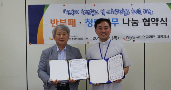 국민연금공단 고양지사(지사장 백수현)는 지난 7일 고양시일산종합사회복지관(관장 이정우)과 청렴문화 확산을 위한 반부패·청렴업무 나눔 협약을 체결했다.