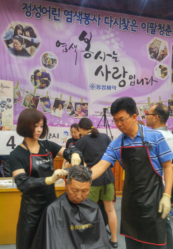 이날 ‘고양시민 복지나눔 1촌맺기 염색행사’는 고양시민 복지나눔 1촌맺기 일환으로 고양시와 고양시사회복지협의회, 고양시지역사회보장협의체가 주최하고 고양시복지관연합회가 주관해 어르신들에게 염색을 해드리는 행사였다. 염색물품은 동성제약이 제공하고 본사와 아산공장 봉사팀 등 임직원 봉사자 100여 명이 참여해 지역 취약계층 어르신 200여 명에게 염색을 해드렸다.