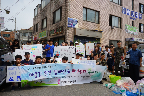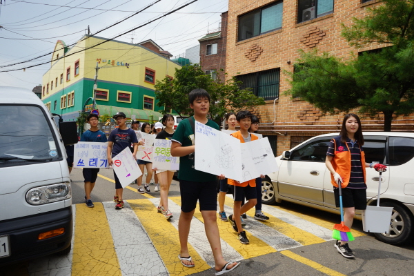 지난 23일 오전, 햇빛마을과 서정마을 아파트숲으로 둘러싸인 행신동 연립주택마을에 청소년들의 목소리가 울려퍼졌다. 손으로 정성껏 그려 만든 피켓을 든 친구들은 “마을에 쓰레기를 버리지 맙시다~!”를 외치며 주민들을 대상으로 환경정화 캠페인 활동을 벌였다. 그 옆에선 집게와 쓰레기봉투를 든 청소년들이 골목에 버려진 쓰레기를 깔끔하게 치웠다. 칙칙했던 골목의 담장에는 봉사자들의 손길에 의해 예쁜 벽화가 그려졌다. 무더위속에서 마을을 위한 봉사활동을 펼친 청소년들의 얼굴에는 보람찬 미소가 떠나질 않았다.