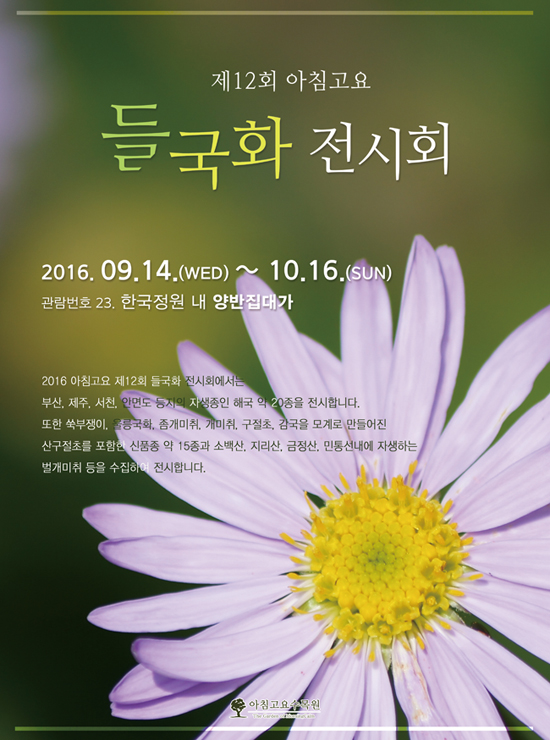 가평 축령산 자락에 자리하고 있는 아침고요수목원은 명절 연휴가 시작되는 14일부터 내달 16일까지 제12회 들국화 축제를 진행한다. 수목원 내 한국정원에서 열리는 이번 전시에서는 제주와 안면도, 영흥도 등에서 자생하는 해국 20여 종을 만나 볼 수 있다. 또한 쑥부쟁이, 울릉국화, 구절초, 감국, 산구절초 등 80여 종의 들국화 120여 작품이 전시된다.