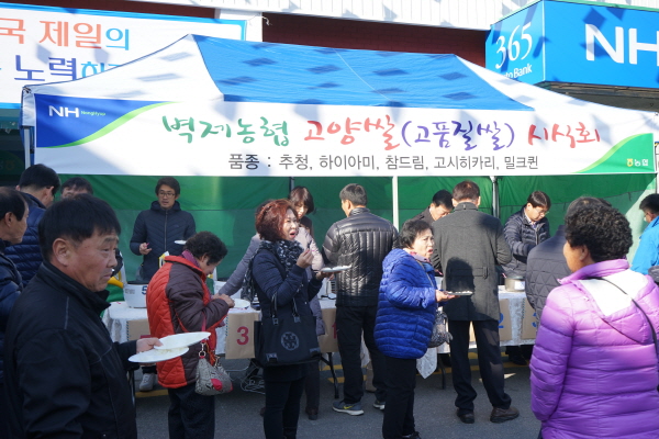 한편 개점식에 앞서 열린 '고양쌀 시식회'도 따끈한 열기 속에 진행됐다. 벽제농협과 고양시농업기술센터가 함께 진행한 고양쌀 시식회는 추청, 하이아미, 고시히카리 등 기존 고품질 품종과 밀크퀸, 참드림 등의 신품종 벼의 밥맛을 비교해보는 행사였다. 쌀쌀한 날씨 속에서 시식회에 참가한 이들은 김이 모락모락 올라오는 갓 지은 밥을 한 술씩 맛본 후 자신의 입맛에 맞는 번호에 투표를 했다. 밥맛에 대한 의견이 분분했지만 품종 이름은 끝까지 공개되지 않아 결과에 대한 궁금증을 더했다. 시식회를 진행한 농업기술센터 관계자는 "새로 개발한 품종에 대해 농업인들로부터 객관적인 평가를 받기 위해 벽제농협과 함께 시식회를 진행하게 됐다"고 말했다. 이승엽 조합장은 시식회를 통해 높은 평가를 받은 품종을 내년도에 적극 보급할 계획이라고 밝혔다.