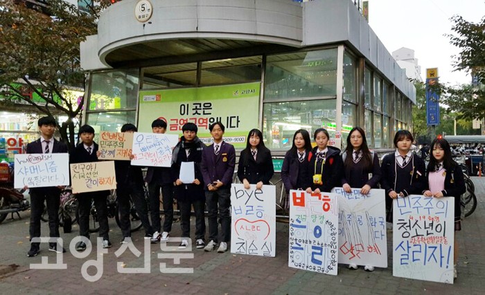 [고양신문] 고양시 대진고등학교 임정환 학생 외 12명은 4일 오후 4시 고양시 일산서구 대화역 앞에서 시국선언문을 낭독하고 박근혜 대통령 하야와 조기대선 실시를 촉구했다.임정환(17세)군은 “재학생 136명의 서명을 받았다”며 “교내에서 피켓팅을 진행하려 했지만 여의치 않아 대화역 앞에서 하게 됐다”고 말했다.