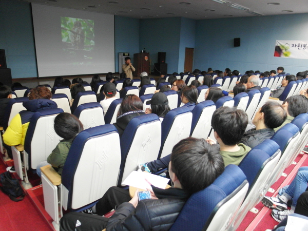 우리가 잘못 알고 있는 환경 상식에 관한 질문을 던지며 재미있게 시작된 강의는 외래 식물의 습격, 사라져가는 새들의 먹이터, 쓰레기로 몸살을 앓고 있는 하천, 위협받고 있는 천연기념물 등 환경의 심각한 실태를 알아보았다. 이어 초등학생들이 살려낸 두꺼비들, 새 모이주기를 통한 생태계 보존, 태안 기름유출을 복구한 자원봉사자들의 힘 등 자원봉사를 통해 환경문제를 해결한 사례들을 전달하며 환경 자원봉사의 중요성을 다시 한 번 상기시켰다.