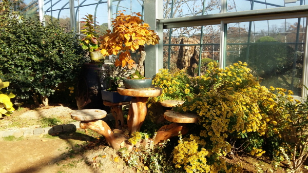 정원의 맨 꼭대기에는 자연석으로 조경을 한 폭포가 경관의 정점을 장식하고 있다. 두어 시간 정원을 거닐며 셔터를 누르다보니 손이 시리다. 폭포 옆에 자리한 유리온실로 들어서니 따뜻한 기운이 감돈다. 온실 한켠에서 햇살을 즐기고 있는 가을꽃들이 마음까지 훈훈하게 해 준다.