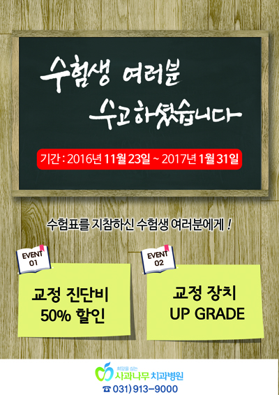 수능이 끝나면서 미뤄왔던 치과 진료를 받으려는 수험생들이 늘어나고 있다. 이에 발맞추어 사과나무치과병원(대표원장 김혜성)이 수험생 치아교정 할인 이벤트를 진행한다. 이번 이벤트는 2017대입 수능을 치른 수험생들이 수험표를 지참하고 내원할 경우 적용되며, 교정 진단비 50% 할인과 교정장치 업그레이드 혜택을 받을 수 있다.