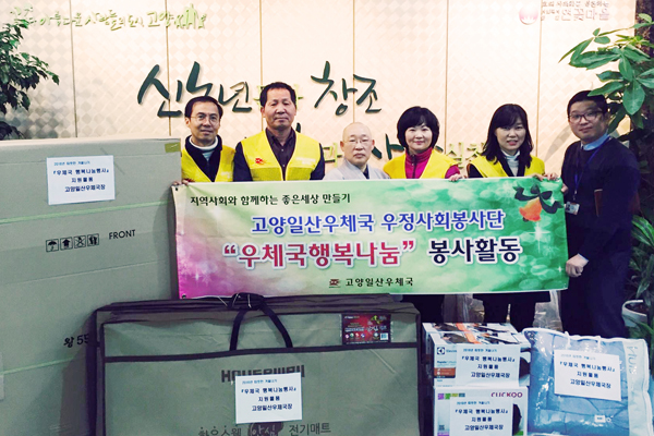 고양일산우체국(국장 윤선혁)은 12월 7일 연말을 맞아 외롭고 소외되기 쉬운 독거어르신을 위해 ‘2016년 따뜻한 겨울나기 우체국 행복나눔 봉사활동’을 가졌다.<사진> 일산우체국은 MOU(업무협약)을 체결한 일산노인복지관에 접수된 소원편지를 통해 저소득 독거어르신 열 분을 직접 방문해 전기장판· 이불·청소기 등을 전달하고 방한을 위한 유리창 단열작업도 진행했다. 윤선혁 고양일산우체국장은 “봉사활동은 자아실현과 자신의 존재에 대한 긍정의 가치를 부여하는 가장 아름다운 방법이다. 일산우체국은 지속적으로 나눔문화 확산을 통해 지역사회에서 사회적 책임을 다하겠다.”고 말했다. 이번 행복나눔 봉사활동은 우체국보험 공익사업의 일환으로 지역사회 발전과 소외계층의 맞춤형 지원활동으로 함께 사는 지역사회 분위기를 조성했다.