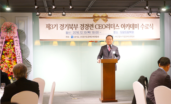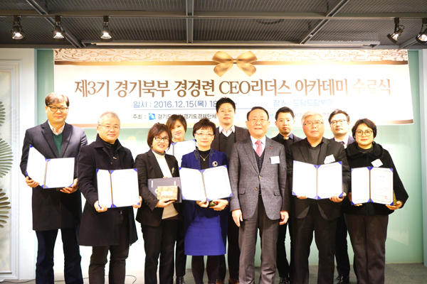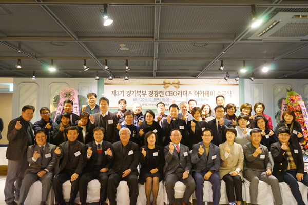 [고양신문] 경기도 북부 기업 및 경제인들이 경영해법을 학습하고 공유하기 위한 ‘제3기 경경련 CEO 리더스 아카데미’ 수료식이 15일 킨텍스 도담도담뷔페에서 열렸다. 경기도와 (사)경기도경제단체연합회(이하 경경련)가 주최하고 (사)고양기업경제인연합회(이하 고경연)이 주관한 경경련CEO리더스아카데미 수료식에는 곽미숙 경기도의회 의원, 김완규·김경희 고양시의회 의원, 이상헌 고경연 회장과 김우택 초대 고경연 회장 및 1·2기 수료생과 4·5기 수강생 등 70여명이 참석했다.