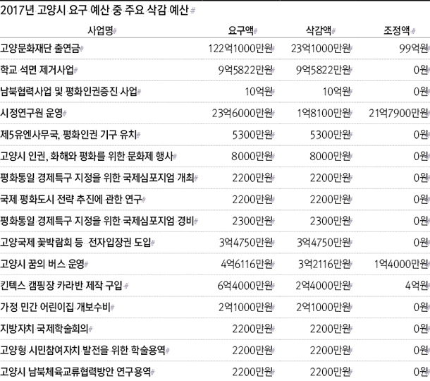 무엇보다 인권·평화를 위한 행사나 회의 관련 예산이 전액 삭감된 것도 이번 예산심사에서 향후 논란을 불러올 여지가 있다. 고양시 인권, 화해와 평화를 위한 문화제 행사비 8000만원, 평화통일경제특구 지정을 위한 국제심포지엄 개최비(2200만원), 국제평화도시 전략 추진에 관한 연구용역(2200만원), 평화통일 경제특구 지정을 위한 국제심포지엄 경비(2300만원) 등이 전액 삭감됐다. 이 외에 남북협력사업 및 평화인권증진 사업 예산 10억이 전액 삭감됐다.